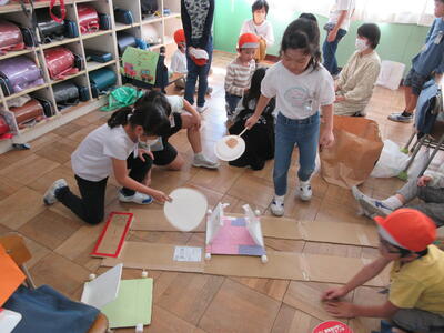 牛乳パックや食品トレイなど、身近にあるものを工夫しておもちゃを作りました。